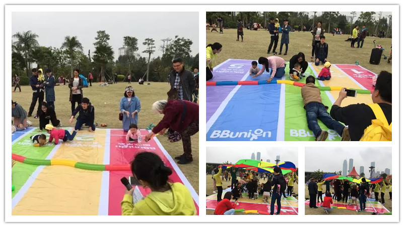 清爽的早晨春风,清新的空气,绿绿的户外大草坪,BBunion国际早教南宁中心与您和宝贝相约在凤岭儿童公园“幸福摩天轮”大草坪下,彩虹伞扑捉漏网小鱼、赛道障碍物、过山洞、按摩操……